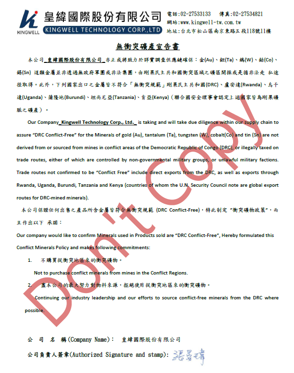 皇緯國際股份有限公司_亦正或將致力於詳實調查供應鏈確保:金(Au)、鉭(Ta)、鎢(W)、鈷(Co)、錫(Sn) 這類金屬並非透過無政府軍團或非法集團,由剛果民主共和國衝突區域之礦區開採或是循非法走 私途徑取得。此外,下列國家出口之金屬皆不符合「無衝突規範」剛果民主共和國(DRC)、盧安達(Rwanda)、烏干達(Uganda)、蒲隆地(Burundi)、坦尚尼亞(Tanzania)、肯亞(Kenya)(聯合國安全理事會認定上述國家皆為剛果礦脈之礦產)。
